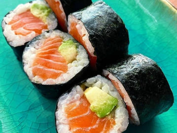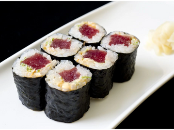 Two tempura shrimp, avocado, cucumber, krab masago, and topped with faux-nagi sauce.